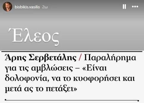 Με μια ανάρτηση στο instagram, ο Βασίλης Μπισμπίκης εξέφρασε την αγανάκτησή του για όσα είχε πει νωρίτερα ο Άρης Σερβετάλης. Η ανάρτηση είχε τον τίτλο της είδησης, με το μονολεκτικό σχόλιο «Έλεος».