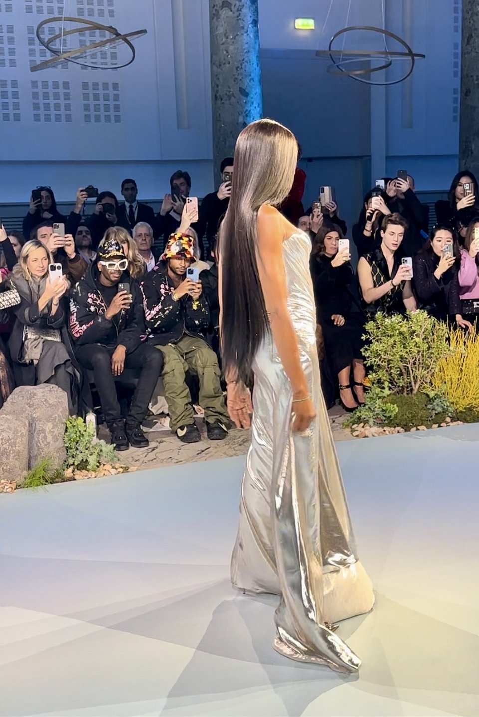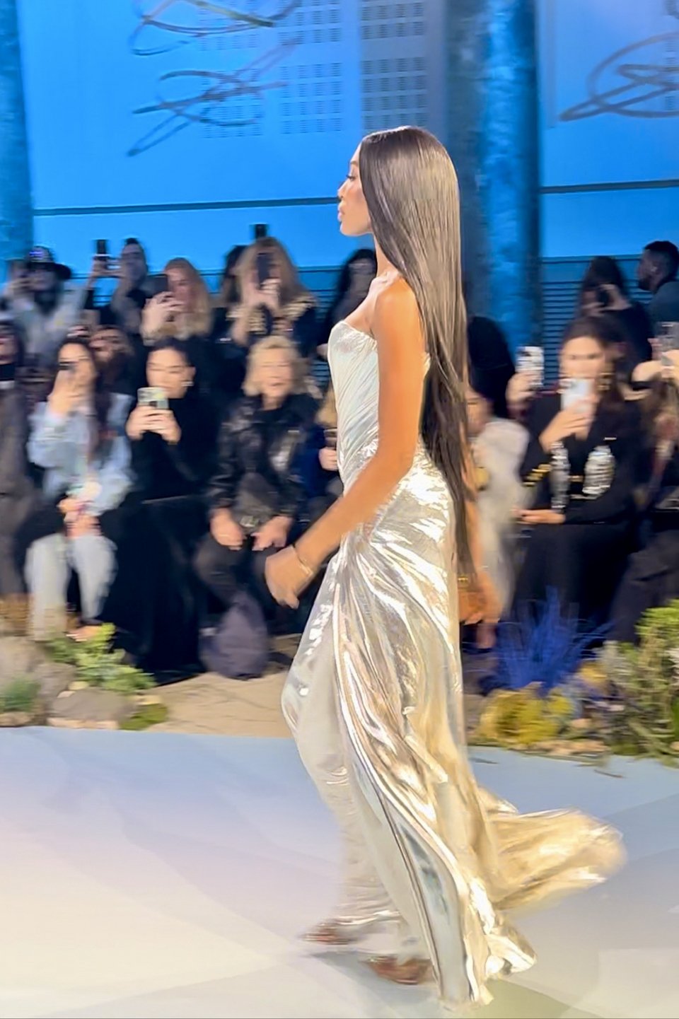 Η «βετεράνος της μόδας» άνοιξε την επίδειξη με θεαματικό τρόπο φορώντας ένα εντυπωσιακό ασημένιο μεταλλιζέ φόρεμα. H Κάμπελ είχε τα μακριά, μαύρα της μαλλιά ίσια κάτω και όπως ήταν αναμενόμενο έκλεψε την παράσταση.