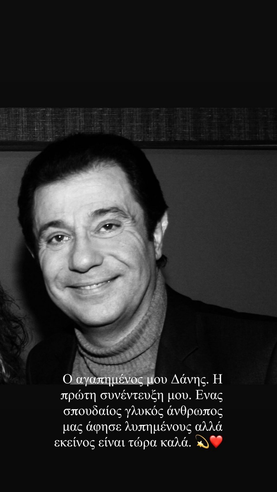 Η παρουσιάστρια του ALPHA έκανε ένα story στο Instagram για την απώλεια του σπουδαίου ηθοποιού, αποκαλύπτοντας ότι ήταν ο πρώτος άνθρωπος που της έδωσε συνέντευξη, ενώ συμπλήρωσε ότι «μας άφησε λυπημένους, αλλά εκείνος είναι καλά».