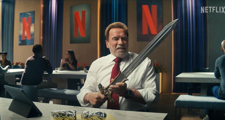 Το βίντεο -το οποίο δείχνει επίσης τον Σβαρτσενέγκερ να κόβει ένα μπουρίτο στη μέση χρησιμοποιώντας ένα σπαθί, στο εστιατόριο των γραφείων του Netflix- απαριθμεί την επερχόμενη σειρά ταινιών γεμάτων δράση του Netflix, όπως το Extraction 2 και την 3η σεζόν του The Witcher.