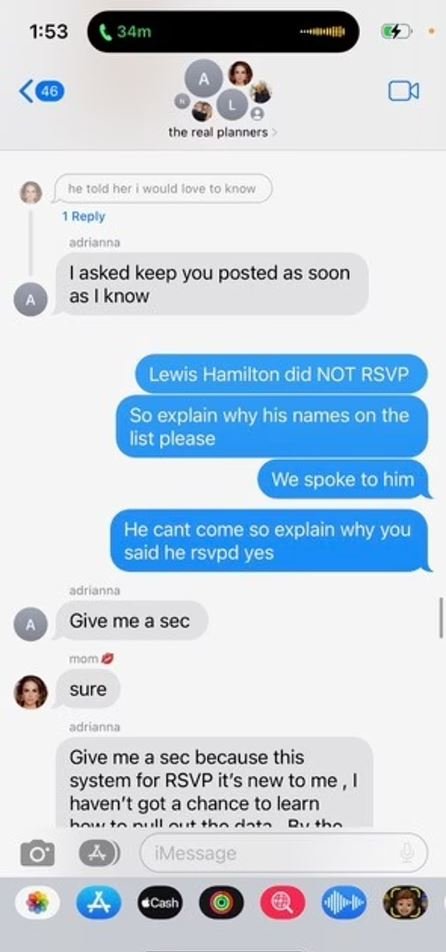 Σε ένα μήνυμα που στάλθηκε περίπου μία εβδομάδα πριν από τη συζήτηση για την απάντηση του Λιούις Χάμιλτον, η διοργανώτρια έγραψε στη συνομιλία πως «θα πήγαινε για μία τεκίλα πριν εκραγεί το κεφάλι της», στην οποία η Νίκολα απάντησε: «Ναι, βασίλισσα».
