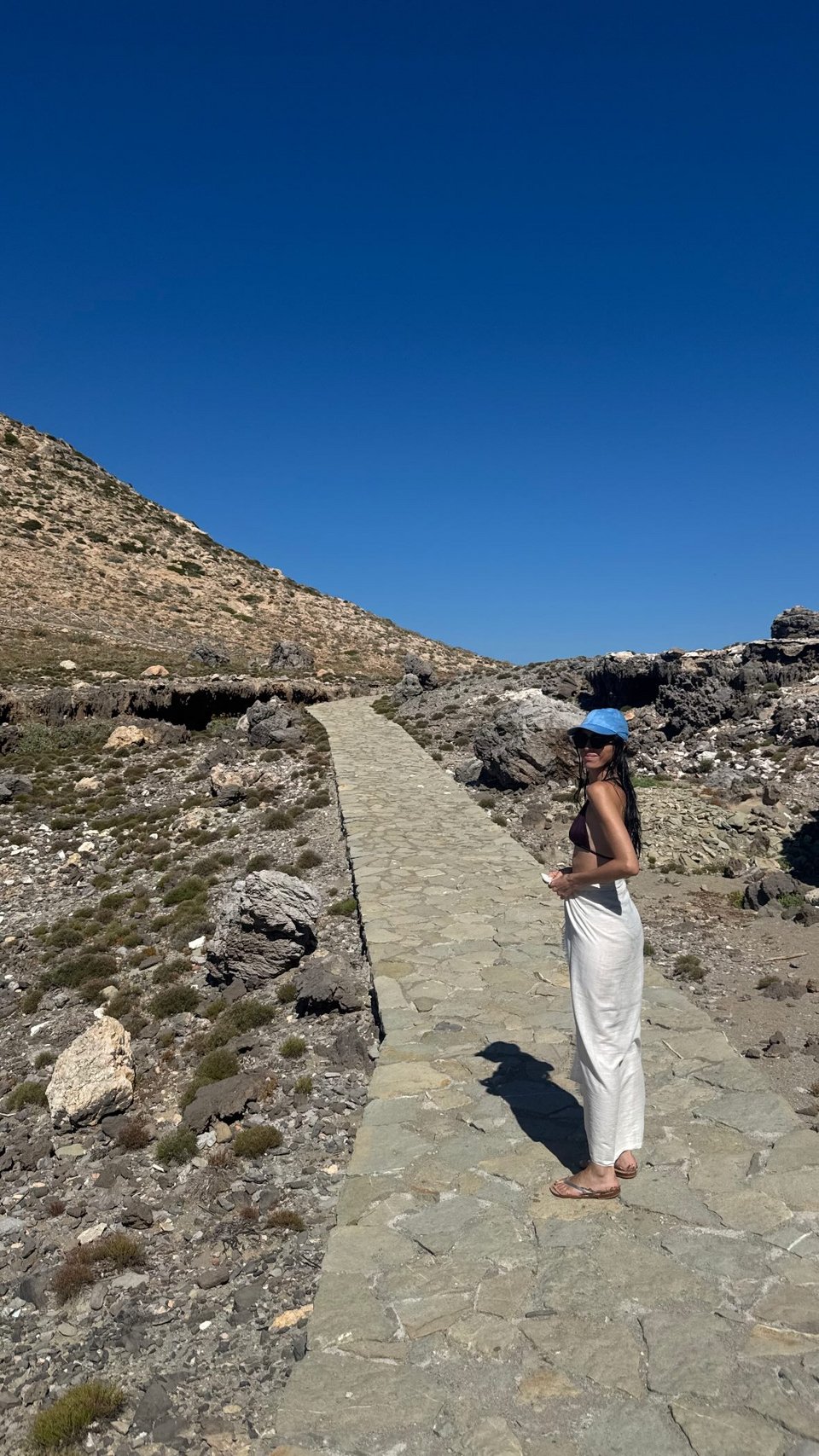Σε άλλη στιγμή, φωτογραφίζει τον αγαπημένο της, που φορά γαλάζιο πουκάμισο και κρεμ παντελόνι, να ποζάρει μπροστά από μια ιταλική πιτσαρία με ντόπιο φαγητό της Σικελίας, ενώ σε άλλη φωτογραφία ποζάρει η ίδια με μαγιό, παρεό, γυαλιά ηλίου και καπέλο με φόντο το άγριο τοπίο.