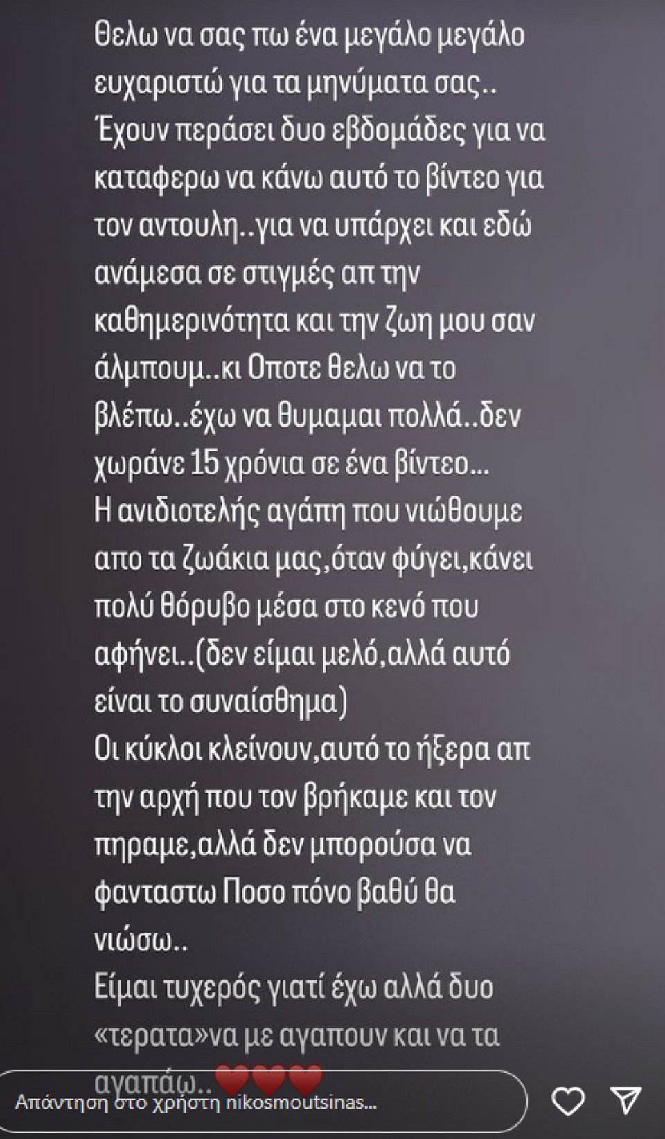 Ο Νίκος Μουτσινάς έγραψε χαρακτηριστικά: «Θέλω να σας πω ένα μεγάλο μεγάλο ευχαριστώ για τα μηνύματά σας... Έχουν περάσει δυο εβδομάδες για να καταφέρω να κάνω αυτό το βίντεο για τον Αντούλη.. για να υπάρχει και εδώ ανάμεσα σε στιγμές απ' την καθημερινότητα και την ζωή μου σαν άλμπουμ... κι όποτε θέλω να το βλέπω.. έχω να θυμάμαι πολλά.. δεν χωράνε 15 χρόνια σε ένα βίντεο... Η ανιδιοτελής αγάπη που νιώθουμε από τα ζωάκια μας, όταν φύγει, κάνει πολύ θόρυβο μέσα στο κενό που αφήνει.. (δεν είμαι μελό, αλλά αυτό είναι το συναίσθημα). Οι κύκλοι κλείνουν, αυτό το ήξερα απ' την αρχή που τον βρήκαμε και τον πήραμε, αλλά δεν μπορούσα να φανταστώ πόσο πόνο βαθύ θα νιώσω.. Είμαι τυχερός γιατί έχω άλλα δύο "τέρατα" να με αγαπούν και να τα αγαπάω..».