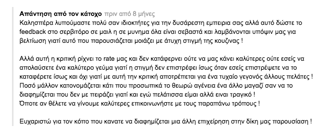 Έχει ενδιαφέρον πως ο Κύπριος χρήστης σχολιάζει πως οι ιδιοκτήτες – δηλαδή η Ντέμη του MasterChef 4 και σύζυγός της – συνηθίζουν να απαντούν με ειρωνικό τρόπο σε όσους τους κάνουν αρνητική κριτική. «Ελπιζω βέβαια οι ιδιοκτήτες αντί να απαντήσουν ειρωνικά στα σχόλια μου, όπως είναι η συνήθης τακτική τους σε προηγούμενα σχόλια πελατών [...] να κοιτάξουν να καλυτερέψουν τόσο την ποιότητα όσο και την εξυπηρέτηση».