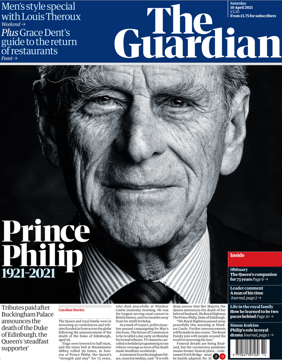 O Guardian κυκλοφορεί με ένα ασπρόμαυρο πορτραίτο του πρίγκιπα Φιλίππου για εξώφυλλο ενώ αναφέρεται στις αντιδράσεις στην είδηση του θανάτου του. Μεταξύ άλλων αναφέρει ότι αφιερώματα για τον πρίγκιπα Φίλιππο έχουν πλημμυρίσει όλο τον κόσμο, ενώ σε ένδειξη σεβασμού τα πολιτικά κόμματα σταμάτησαν την εκστρατεία για τις εκλογές του Μαϊου. Η Βουλή των Κοινοτήτων θα συγκληθεί μια μέρα νωρίτερα τη Δευτέρα για μια ειδική συνεδρίαση απόδοσης τιμών, ενώ τα κανάλια ακύρωσαν το τυπικό τους πρόγραμμα την Παρασκευή.