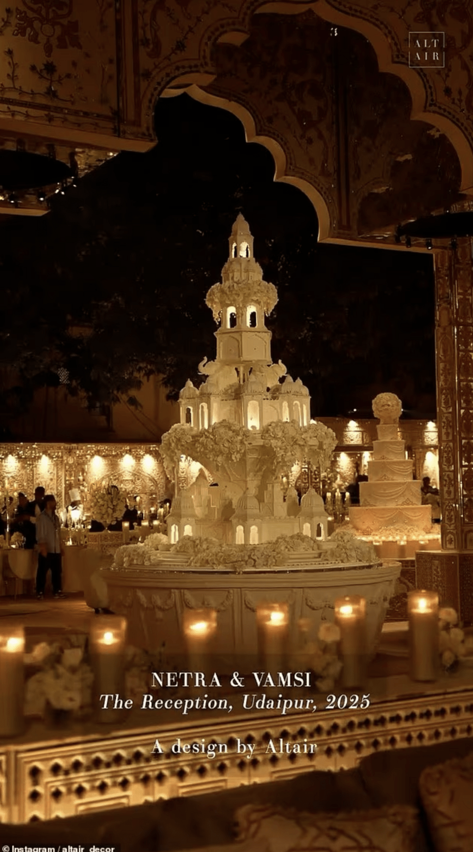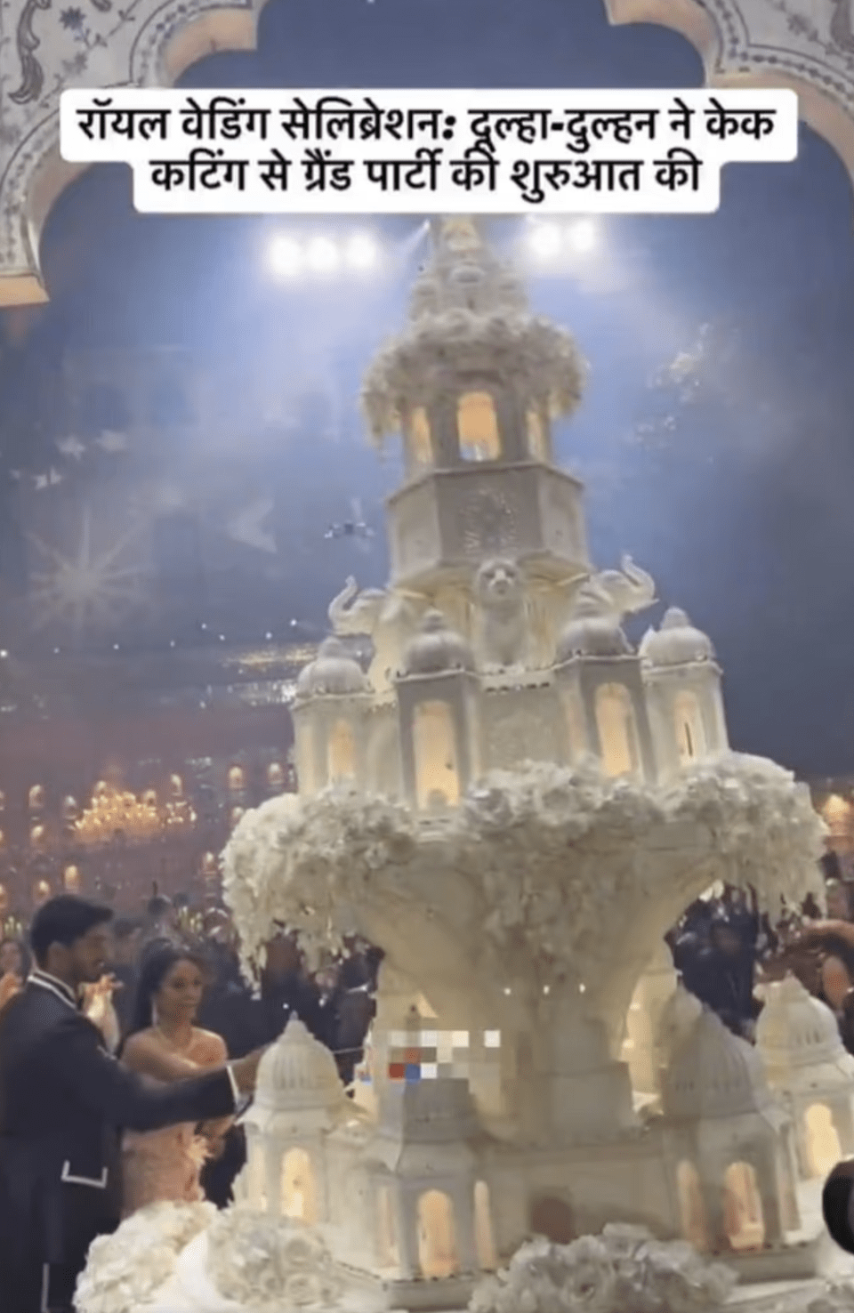 Εντυπωσιακή και η γαμήλια τούρτα, ύψους 4,5 μέτρων, σε σχήμα μίνι παλατιού, την οποία έφτιαξε ο ζαχαροπλάστης Bastien Blanc-Tailleu, με έδρα το Παρίσι, σύμφωνα με ινδικά μέσα ενημέρωσης.