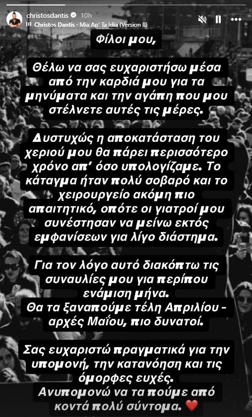«Φίλοι μου, θέλω να σας ευχαριστήσω μέσα από την καρδιά μου για τα μηνύματα και την αγάπη που μου στέλνετε αυτές τις μέρες. Δυστυχώς η αποκατάσταση του χεριού μου θα πάρει περισσότερο χρόνο από όσο υπολογίζαμε. Το κάταγμα ήταν πολύ σοβαρό και το χειρουργείο ακόμη πιο απαιτητικό, οπότε οι γιατροί μου συνέστησαν να μείνω εκτός εμφανίσεων για λίγο διάστημα», ανέφερε χαρακτηριστικά.