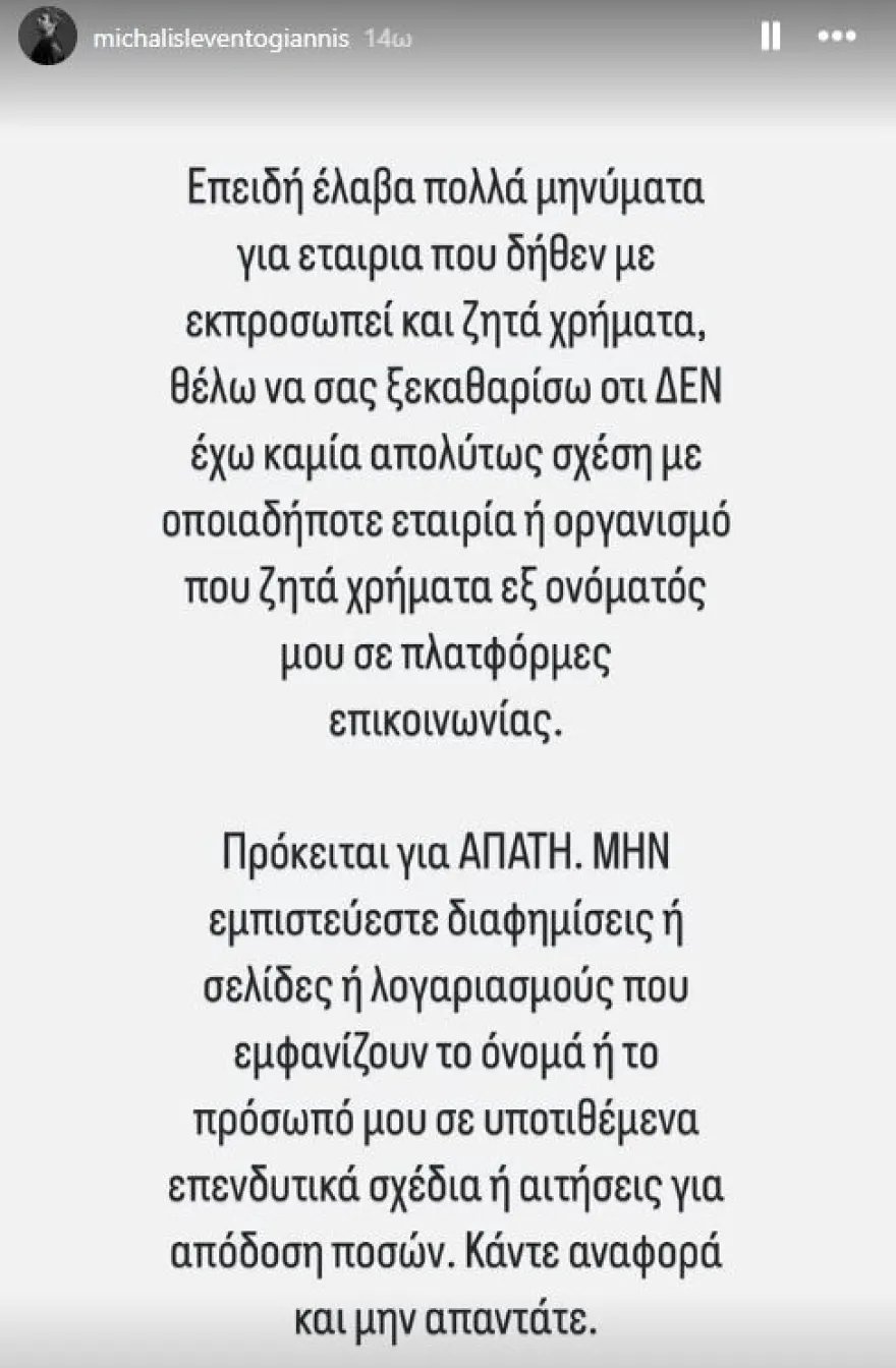 Συγκεκριμένα, ο Μιχάλης Λεβεντογιάννης έγραψε: «Επειδή έλαβα πολλά μηνύματα για εταιρεία που δήθεν με εκπροσωπεί και ζητά χρήματα, θέλω να σας ξεκαθαρίσω ότι ΔΕΝ έχω καμία απολύτως σχέση με οποιαδήποτε εταιρεία ή οργανισμό που ζητά χρήματα εξ’ ονόματός μου σε πλατφόρμες επικοινωνίας. «Πρόκειται για ΑΠΑΤΗ. Μην εμπιστεύεστε διαφημίσεις ή λογαριασμούς ή σελίδες που εμφανίζουν το όνομα ή το πρόσωπό μου σε υποτιθέμενα επενδυτικά σχέδια ή αιτήσεις για απόδοση ποσών. Κάντε αναφορά και μην απαντάτε».