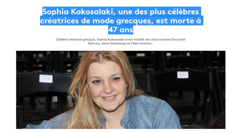 «Έφυγε στα 47 της χρόνια η σχεδιάστρια μόδας Σοφία Κοκοσαλάκη. Γνωστή για την κομψότητά της, η Ελληνίδα σχεδιάστρια έφτιαχνε τουαλέτες για το κόκκινο χαλί, σχεδίασε τα κοστούμια για τους Ολυμπιακούς Αγώνες της Ελλάδας και κομψά γαμήλια φορέματα», αναφέρει η βρετανική εφημερίδα.
