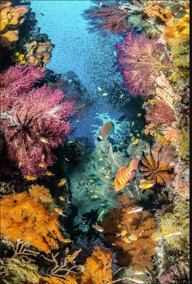 Καλειδοσκόπιο χρωμάτων, Catherine Holmes, Ηνωμένο Βασίλειο: «Η θάλασσα της Raja Ampat, στην Ινδονησία, είναι ένας μαγικός προορισμός. Είχα την τύχη να βρω τέλειες συνθήκες με καθαρά νερά και κοπάδια ψαριών να στροβιλίζονται ανάμεσα στα φαράγγια ενός μεγάλου κοραλλιογενούς υφάλου, στολισμένου με καταπράσινα μαλακά κοράλλια», λέει η φωτογράφος.