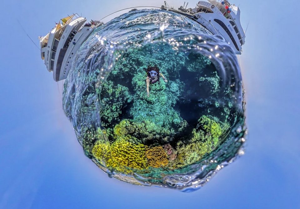 Μπλε Πλανήτης, Jenny Stock, Ηνωμένο Βασίλειο: «Δεν φωτογραφίζω συχνά με compact φωτογραφικές μηχανές, αλλά μου άρεσε πολύ να παίζω με την Insta360 λόγω του μεγάλου πεδίου εφαρμογής της για δημιουργικές εικόνες. Ψάχνοντας μέσα από υλικό που είχα καταγράψει στο σκάφος Ghazala Explorer στην Αίγυπτο, βρήκα ένα καρέ που έλεγε την ιστορία της ζωής στο σκάφος καθώς και της κατάδυσης μέσα σε αιγυπτιακούς υφάλους. Αυτό το καρέ σε χωριστό επίπεδο αποτυπώνει το πλήρωμα στο πίσω μέρος του καταστρώματος. Προχωρώντας προς τα μέσα, δείχνει την αστραφτερή επιφάνεια του νερού και στη συνέχεια βυθίζεται κάτω στον ζωντανό κοραλλιογενή ύφαλο. Στο κέντρο είμαι εγώ, που αποτυπώνω την εικόνα κρατώντας τη φωτογραφική μηχανή ψηλά», εξηγεί η φωτογράφος.