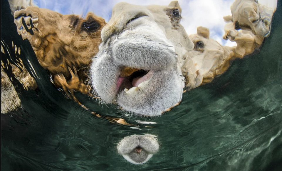Καμήλες, Abdulaziz Al Saleh, Κουβέιτ: «Ήθελα να φωτογραφίσω τις καμήλες στην έρημο Al Wafra που πίνουν νερό από μια αποκλειστικά υποβρύχια προοπτική, επειδή δεν είχα δει καμία εικόνα που να το δείχνει αυτό. Την πρώτη εβδομάδα οι καμήλες ήταν λίγο διστακτικές στο να πιουν ενώ η φωτογραφική μου μηχανή ήταν κάτω από το νερό, αλλά μετά από αρκετές ημέρες οι καμήλες είχαν ήδη αποδεχθεί πλήρως τόσο εμένα όσο και τον εξοπλισμό μου», επισημαίνει ο φωτογράφος.