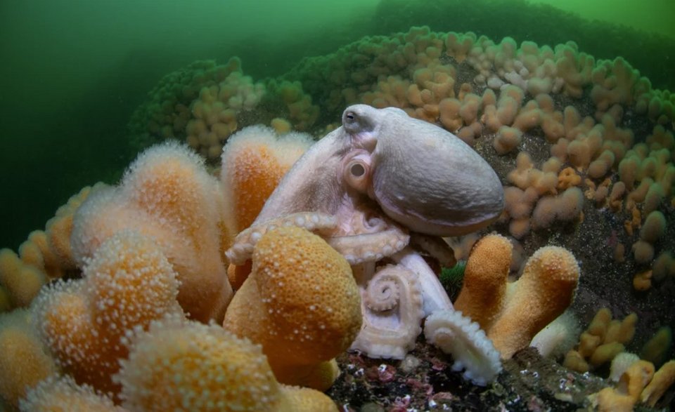 British Waters Wide Angle, Simon Temple, Ηνωμένο Βασίλειο: «Οι συναντήσεις μου με χταπόδια στο Ηνωμένο Βασίλειο είναι συνήθως απρογραμμάτιστες. Αυτή δεν αποτέλεσε εξαίρεση, με ένα χταπόδι σκαρφαλωμένο ψηλά πάνω σε έναν ύφαλο. Η παλίρροια ήταν αδυσώπητη και κατάφερα να τραβήξω μόνο τέσσερις φωτογραφίες πριν με τραβήξει μακριά», τονίζει ο φωτογράφος.
