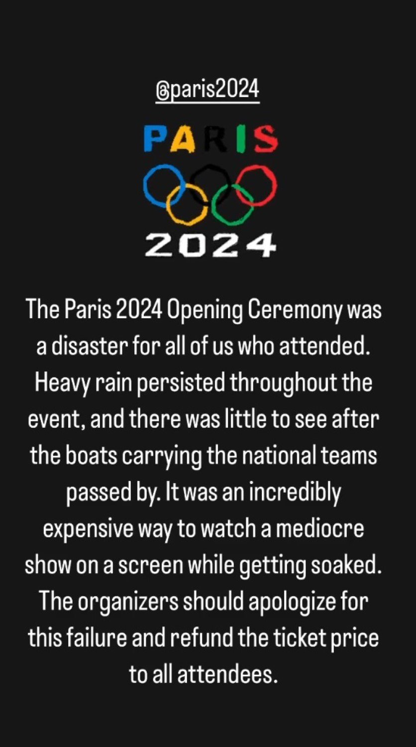 Ενοχλημένος εμφανίστηκε και ο Μίλτος Καμπουρίδης, ο οποίος έγραψε σε σχετικό story: «Η τελετή έναρξης των Ολυμπιακών Αγώνων 2024 στο Παρίσι ήταν καταστροφή για όλους εμάς που παρευρεθήκαμε. Ισχυρή βροχή επέμεινε καθ’ όλη τη διάρκεια της διοργάνωσης, και δεν υπήρχε τίποτα να δούμε μετά το πέρασμα των πλοιαρίων που μετέφεραν τις εθνικές ομάδες. Ήταν ένας πανάκριβος τρόπος να δεις ένα μέτριο show σε μια οθόνη, ενώ γίνεσαι μούσκεμα. Οι διοργανωτές θα πρέπει να ζητήσουν συγγνώμη για αυτή την αποτυχία και να επιστρέψουν την τιμή του εισιτηρίου σε όλους τους παρευρισκόμενους».