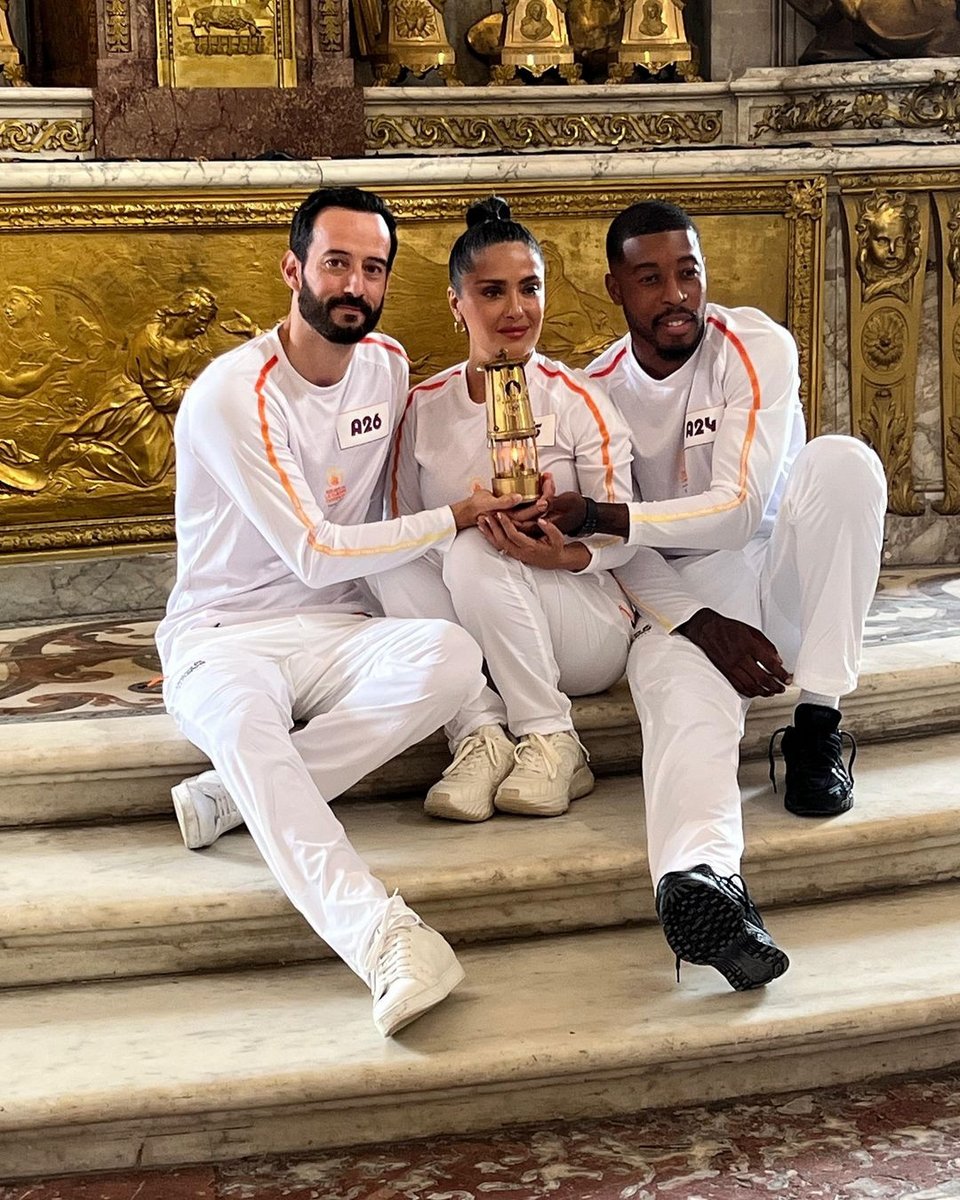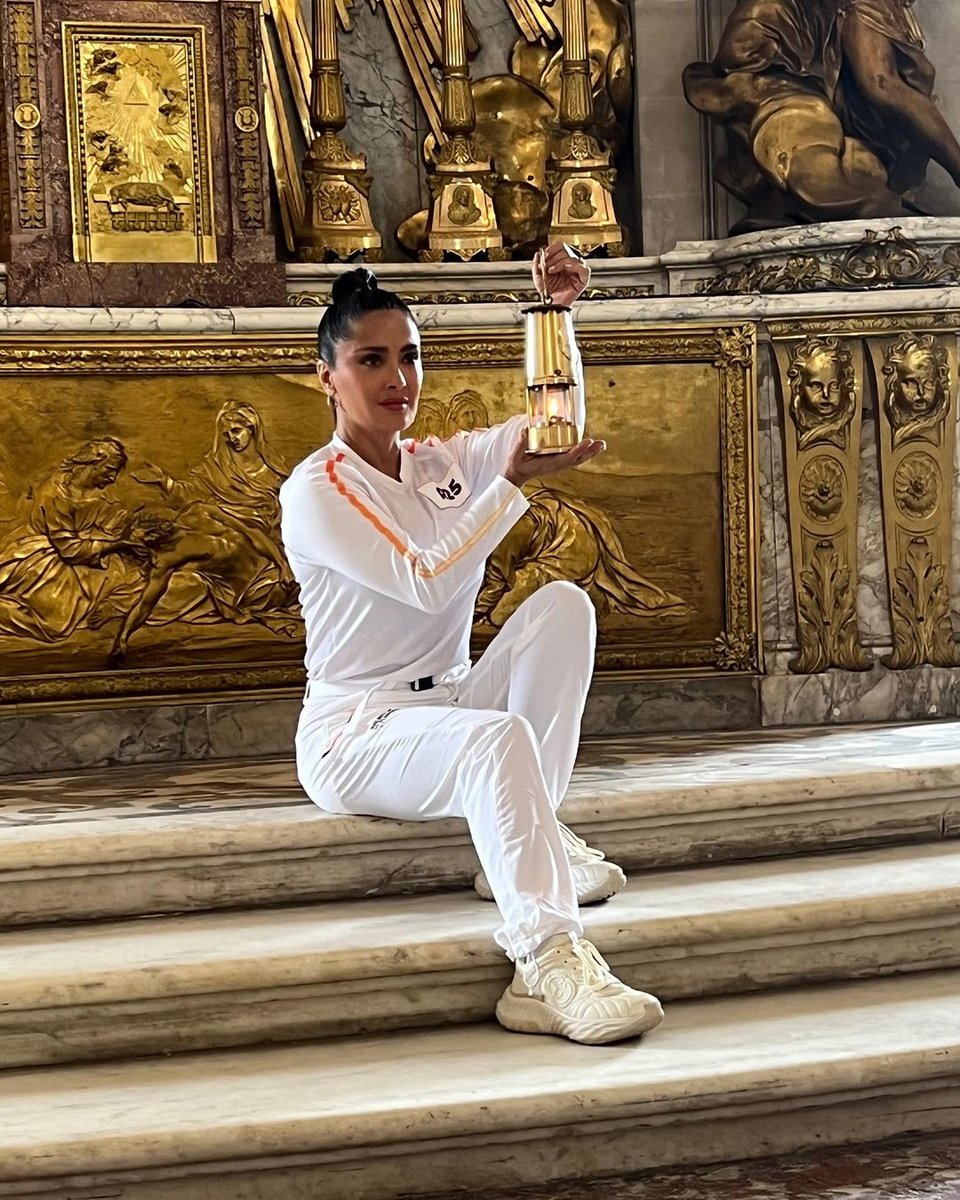 Η Σάλμα Χάγιεκ συμμετείχε μαζί με σημαντικές γαλλικές διασημότητες, δημόσια πρόσωπα και αθλητές στην επίσημη λαμπαδηδρομία στις Βερσαλλίες ενόψει των Ολυμπιακών Αγώνων 2024.