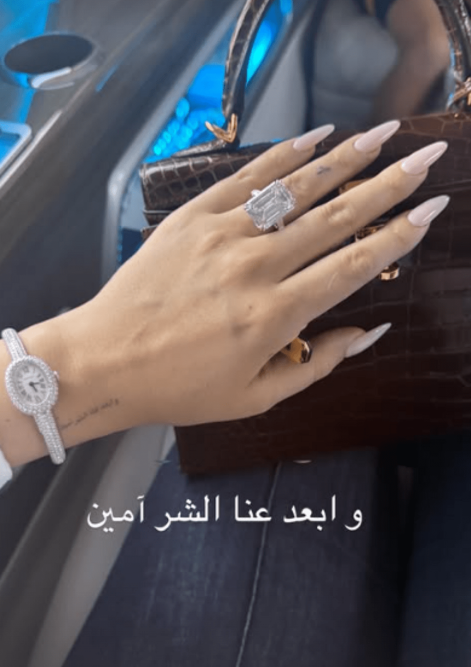 Η εντυπωσιακή influencer και μοντέλο ανέβασε τη Δευτέρα 15 Απριλίου στον λογαριασμό της στο Instagram μία εικόνα, στην οποία πρωταγωνιστεί ένα εντυπωσιακό δαχτυλίδι με διαφανή, ορθογώνιο πολύτιμο λίθο - ένα μονόπετρο που πολλοί ερμήνευσαν ως ένδειξη αρραβώνα.