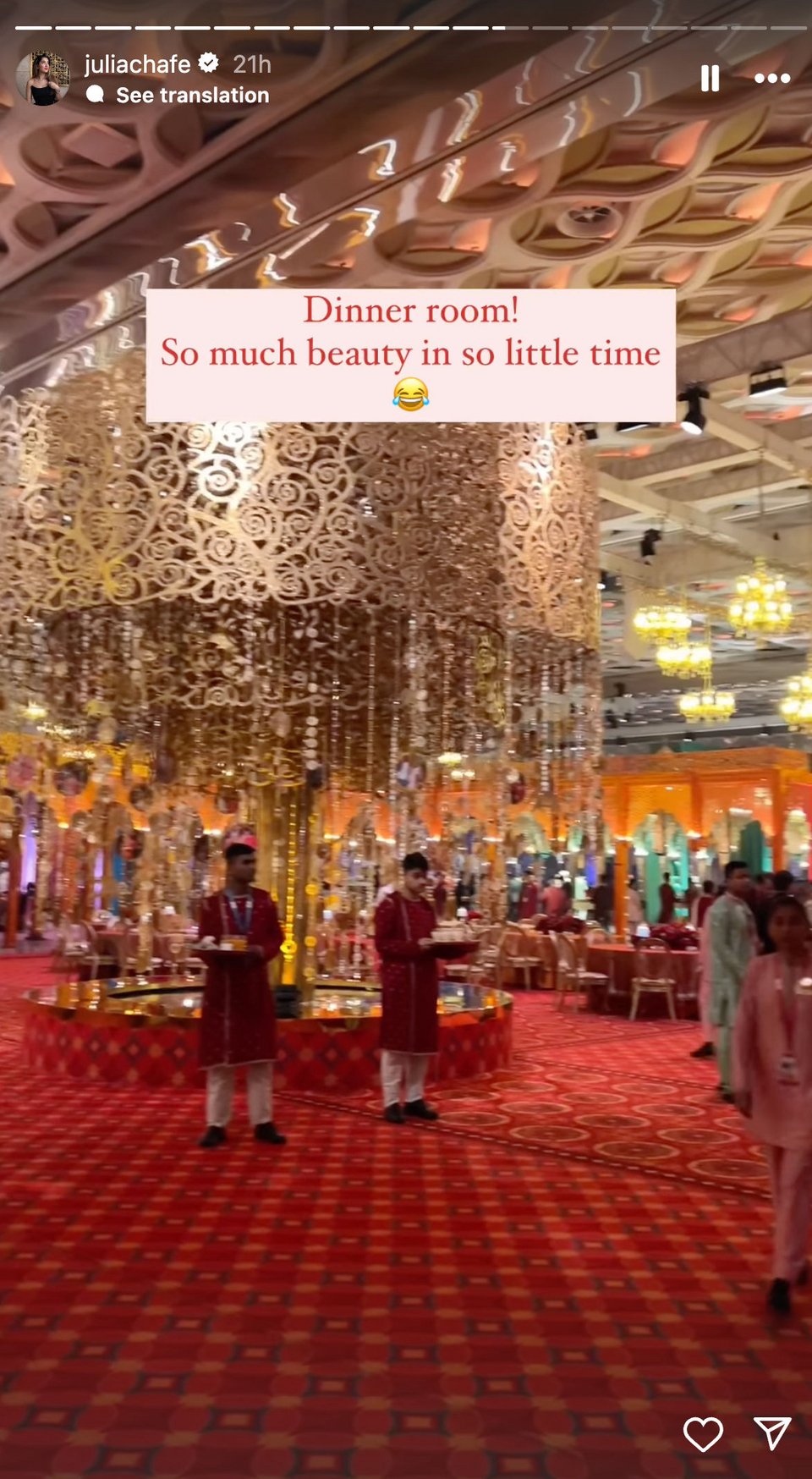 Και μέσα στην κύρια αίθουσα του γάμου έπεσε πάνω σε σταρ όπως ο John Cena, η ηθοποιός Priyanka Chopra και ο τραγουδιστής σύζυγός της Nick Jonas, ο παραγωγός και ηθοποιός του Bollywood Salman Khan και ο πρώην πρωθυπουργός του Ηνωμένου Βασιλείου Boris Johnson, ο οποίος «απλά χαλάρωνε», σύμφωνα με την Julia.