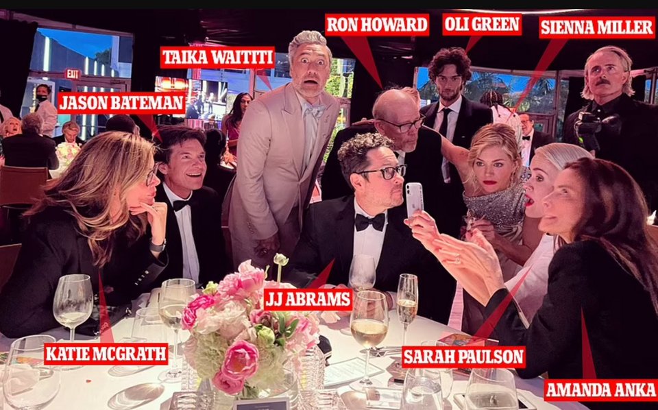 Η εικόνα δείχνει τις έκπληκτες αντιδράσεις του Bateman και της συζύγου του Amanda Anka, του Taika Waititi, της Miller και του αγαπημένου της Oli Green, της Sarah Paulson και των σκηνοθετών Ron Howard και JJ Abrams καθώς και της συζύγου του τελευταίου, Katie McGrath.