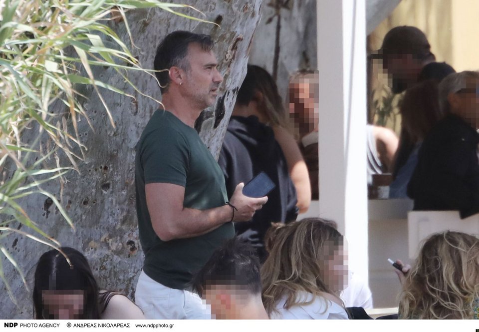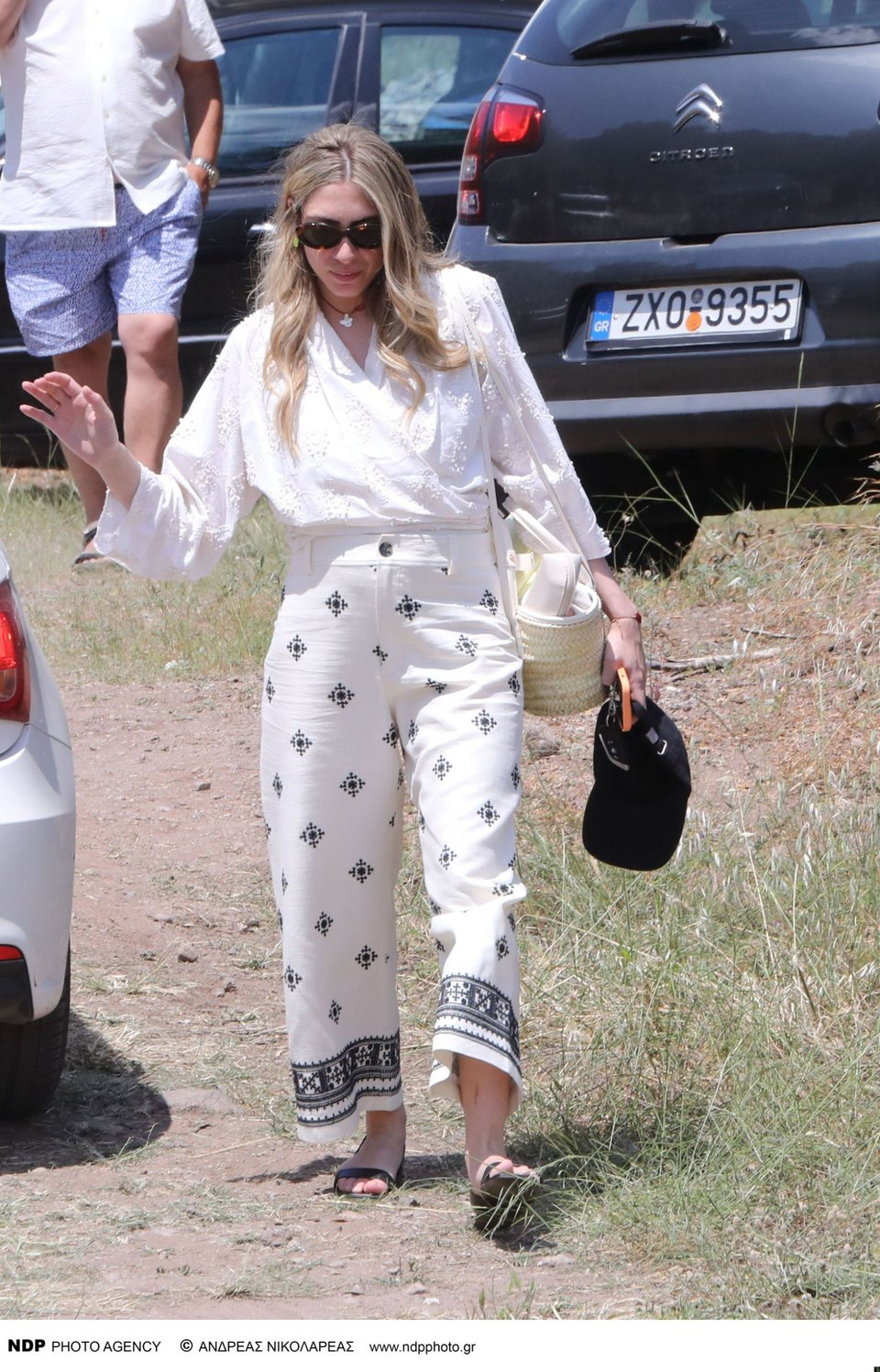 Η νύφη χαλαρή με παντελόνα-πουκάμισο και ένα μεγάλο καπέλο έφθασε με τον σύζυγό της πλέον Πάνο Μουζουράκη για να περάσουν όμορφα το χαλαρό απόγευμά τους με τους καλεσμένους τους απολαμβάνοντας τον ήλιο και τη θάλασσα της εντελώς καλοκαιρινής αυτής ημέρας.