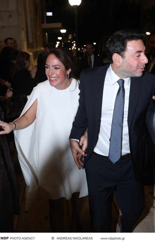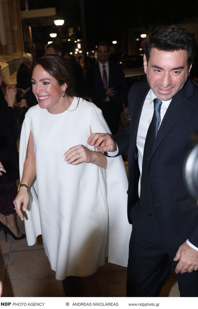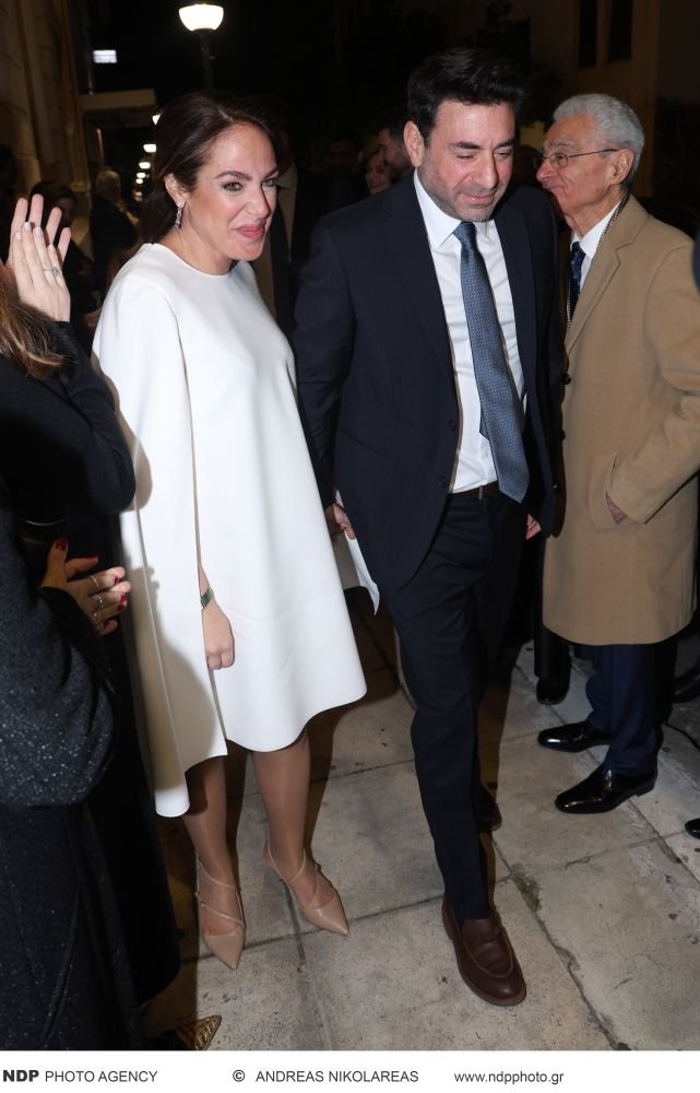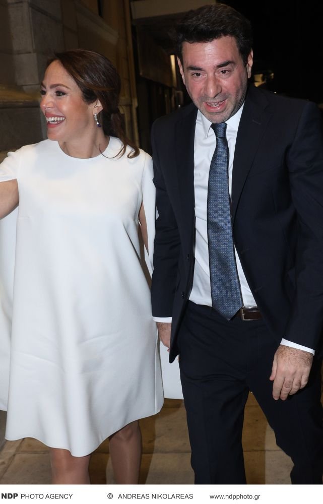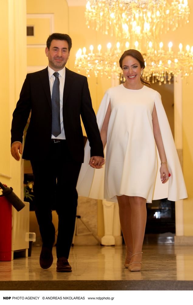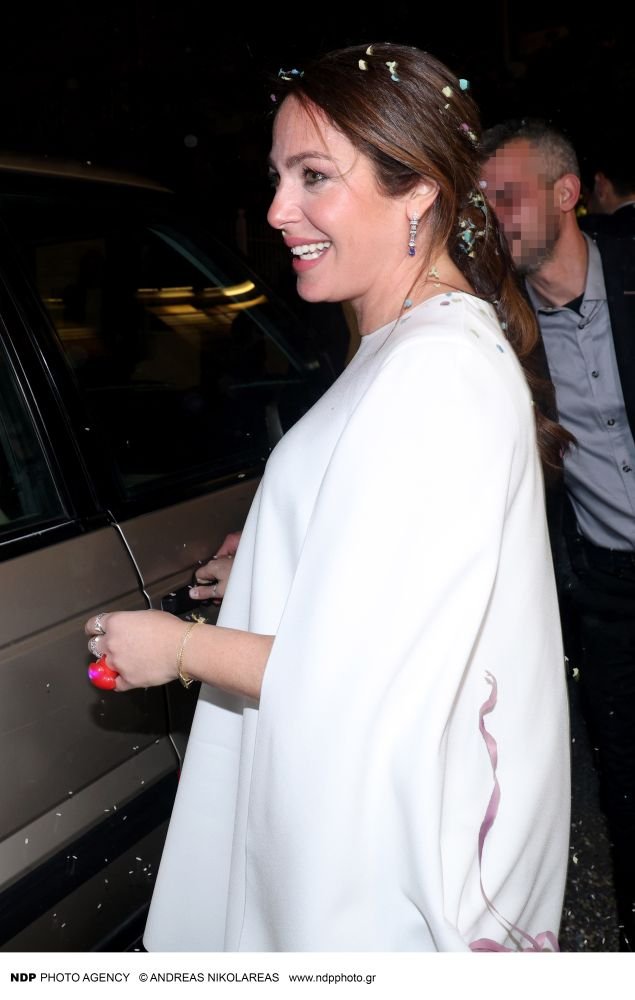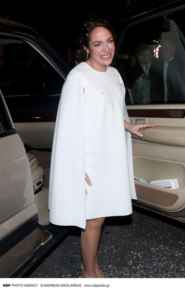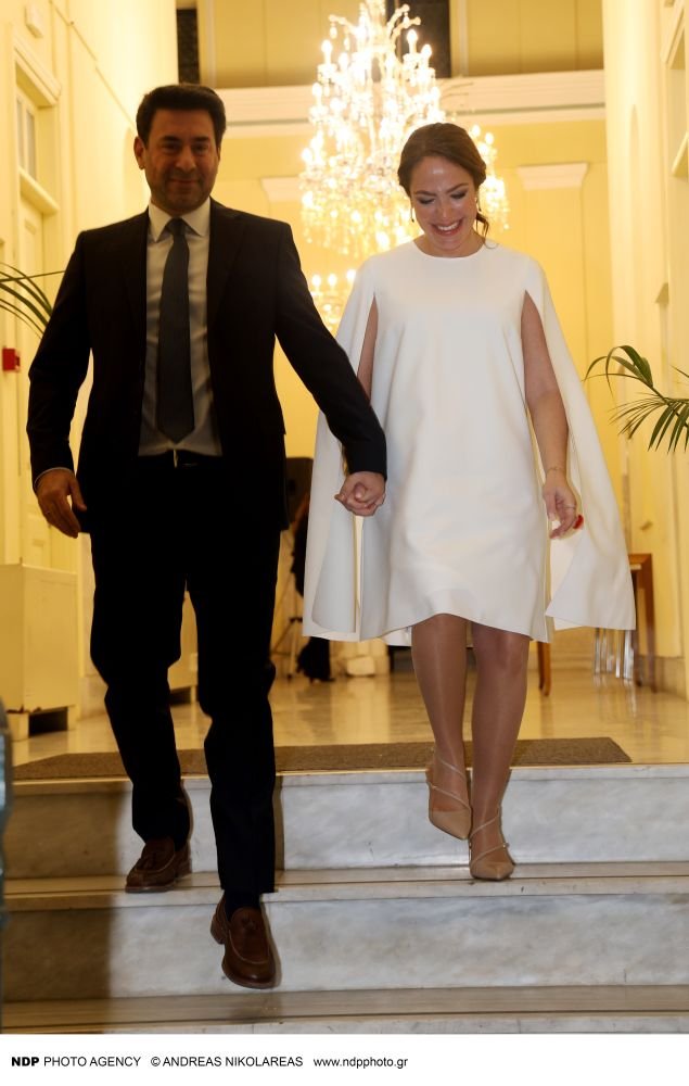 Η εγκυμονούσα νύφη, Δόμνα Μιχαηλίδου ήταν εντυπωσιακή, φορώντας ένα λευκό φόρεμα με ενσωματωμένη κάπα.