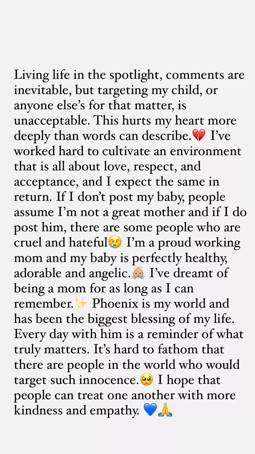 Και πρόσθεσε: «Αν δεν ποστάρω το μωρό μου, οι άνθρωποι υποθέτουν ότι δεν είμαι καλή μητέρα και αν τον ποστάρω, υπάρχουν κάποιοι άνθρωποι που είναι σκληροί και μισητοί Είμαι μια περήφανη εργαζόμενη μαμά και το μωρό μου είναι απόλυτα υγιές, αξιολάτρευτο και αγγελικό. Ο Φοίνιξ είναι ο κόσμος μου και ήταν η μεγαλύτερη ευλογία της ζωής μου. Κάθε μέρα μαζί του είναι μια υπενθύμιση του τι πραγματικά έχει σημασία. Είναι δύσκολο να φανταστώ ότι υπάρχουν άνθρωποι που θα στοχοποιούσαν μια τέτοια αθωότητα. Ελπίζω πως οι άνθρωποι μπορούν να συμπεριφέρονται ο ένας στον άλλον με περισσότερη καλοσύνη και ενσυναίσθηση».