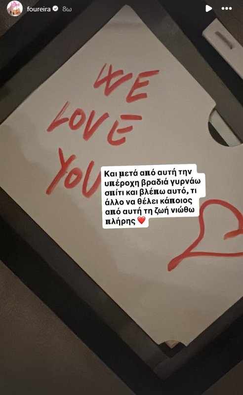 Μέσα από τα stories της η Ελένη Φουρέιρα μοιράστηκε διάφορα στιγμιότυπα από τη βραδιά, όμως, σε ένα αποκάλυψε το μήνυμα που την περίμενε επιστρέφοντας σπίτι. «Σε αγαπάμε» έγραφε το μήνυμα.