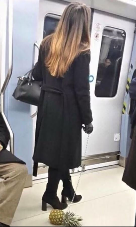 Μία γυναίκα κάνει βόλτα έναν... ανανά με λουρί στο μετρό της Νέας Υόρκης.