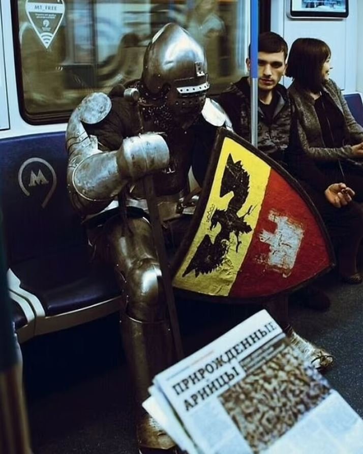 Αυτός ο Ρώσος ιππότης προσελκύει πολλή προσοχή για την πανοπλία του. Είναι αδύνατο να μη μαγνητίσει τα βλέμματα των συνταξιδιωτών του και όχι μόνο.