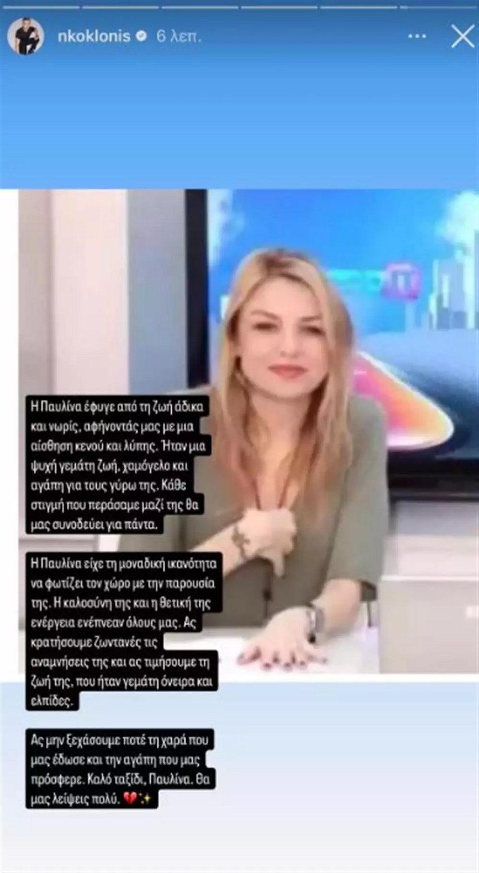 Παράλληλα, και ο Νίκος Κοκλώνης όμως αποχαιρέτησε την δημοσιογράφο με μία άκρως συγκινητική ανάρτηση στα Insta stories του: «Η Παυλίνα έφυγε από τη ζωή άδικα και νωρίς αφήνοντάς μας με μια αίσθηση κενού και λύπης. Ήταν μια ψυχή γεμάτη ζωή, χαμόγελο και αγάπη για τους γύρω της. Κάθε στιγμή που περάσαμε μαζί της θα μας συνοδεύει για πάντα.