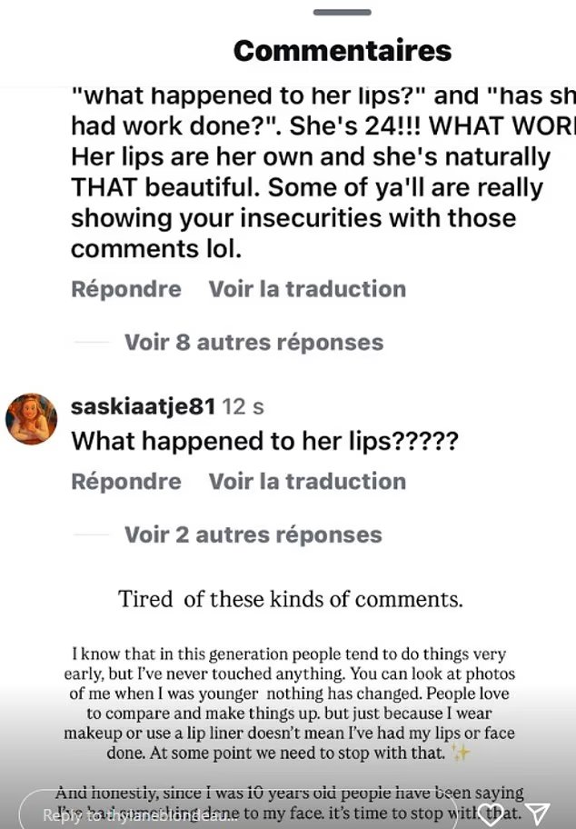 Η 24χρονη μοιράστηκε ένα σχόλιο, στο οποίο κάποιος τη ρωτούσε «τι έχει κάνει στα χείλη της» και παραδέχτηκε πως είναι «κουρασμένη» από τέτοιου είδους σχόλια, τονίζοντας πως δεν έχει κάνει καμία αισθητική παρέμβαση.