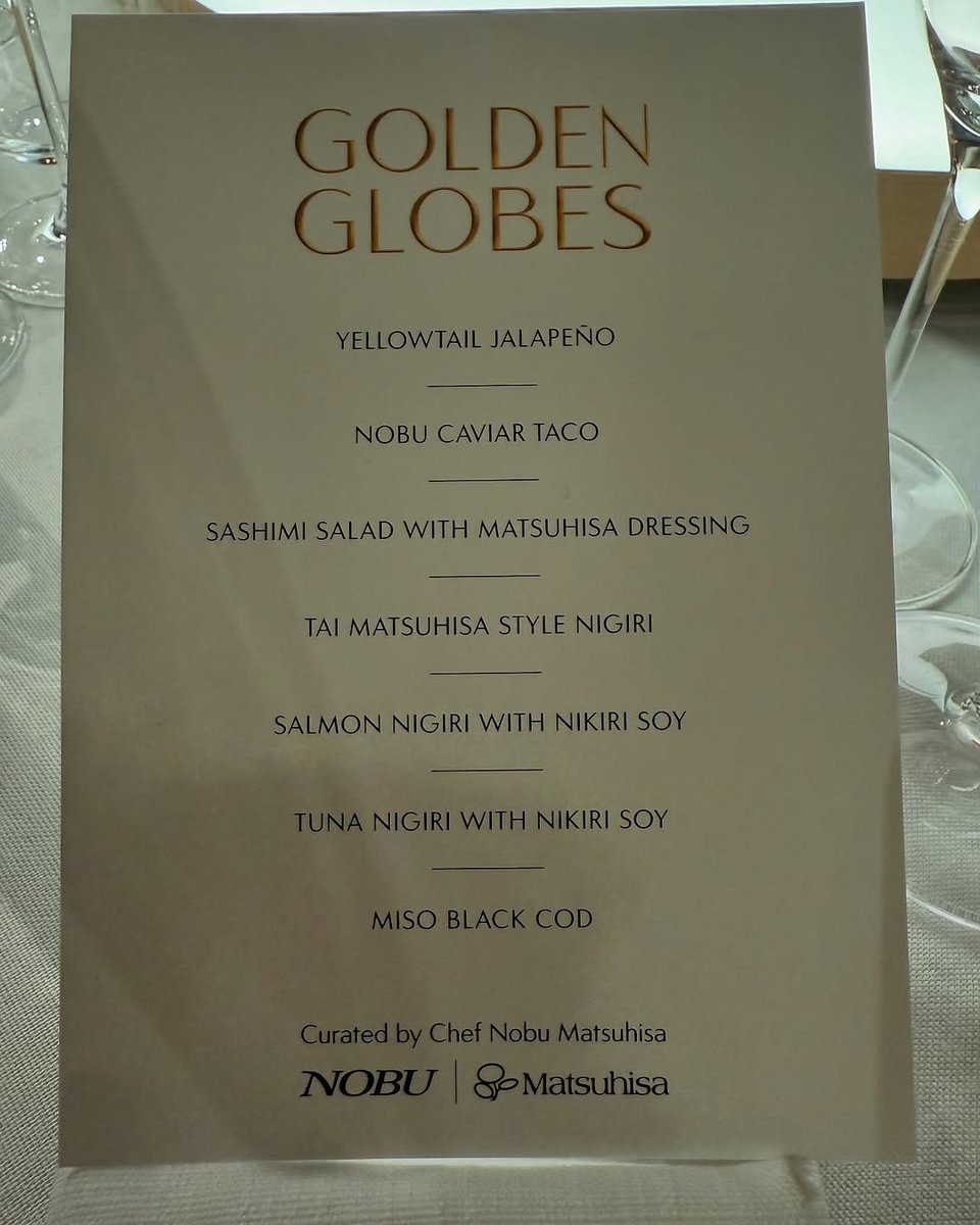 Ανακηρυγμένος ως ο «καλύτερος σεφ στον κόσμο», το πολυτελές μενού περιλάμβανε τα εμβληματικά πιάτα του σεφ Nobu Matsuhisa, συμπεριλαμβανομένου ενός ειδικού Golden Globe Roll.