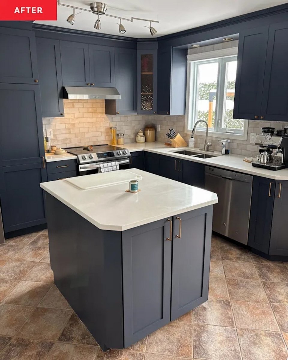 Έβαψε τη βάση της νησίδας στην ίδια navy απόχρωση και πρόσθεσε πάγκο χαλαζία από την IKEA. (Στην πραγματικότητα αντικατέστησε όλους τους πάγκους της κουζίνας, που αποτέλεσαν και τη μεγαλύτερη δαπάνη στο συνολικό πρότζεκτ, κόστους περίπου 5.000 δολαρίων).
