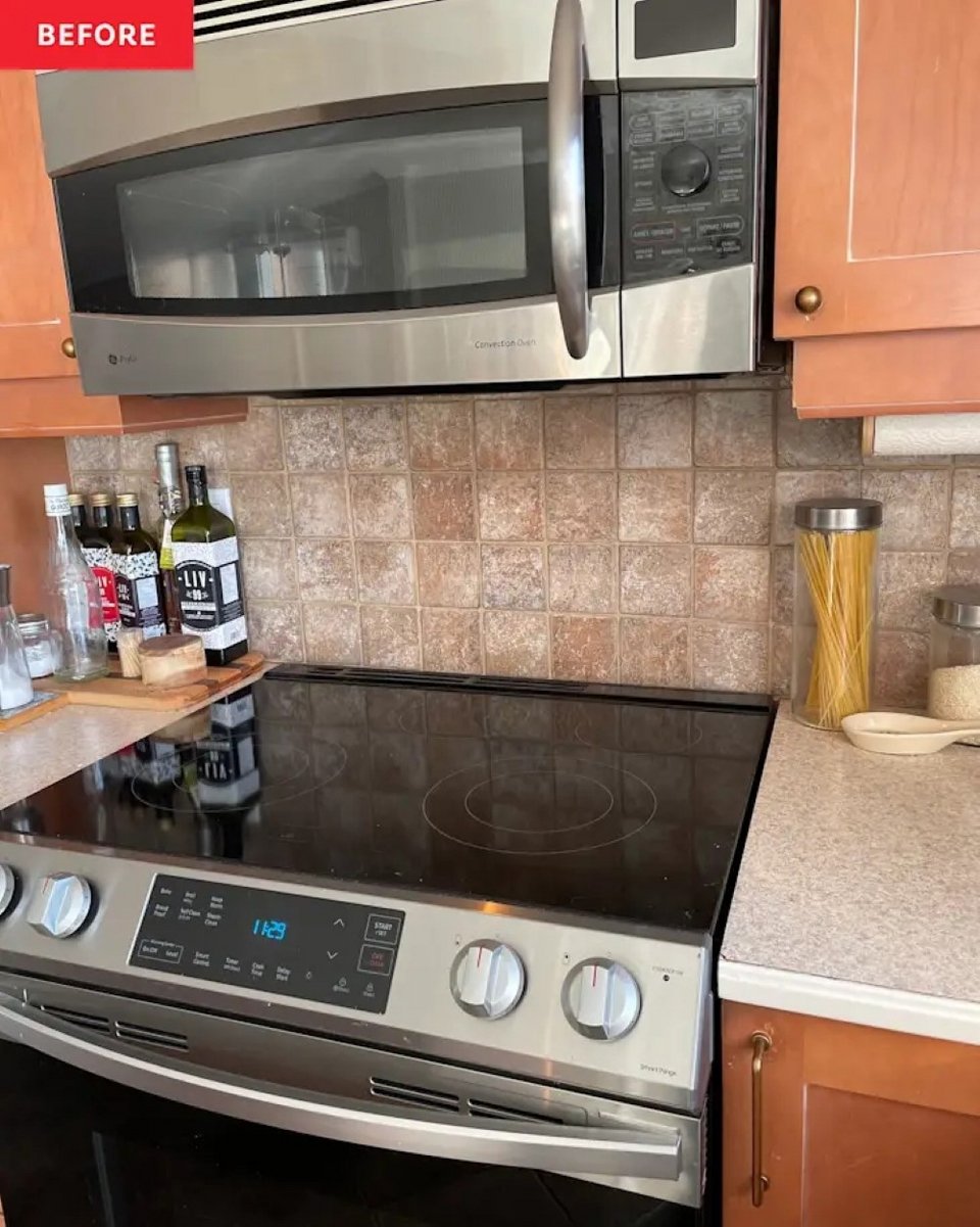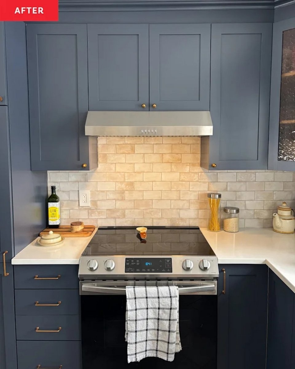 Η νέα πλάτη της κουζίνας βοήθησε στην εξάλειψη των πορτοκαλί τόνων
