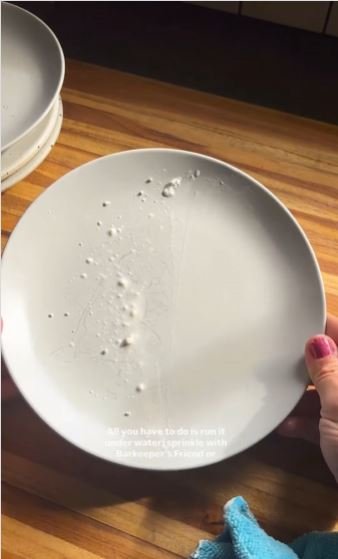 Στο βίντεο, η influencer δείχνει πώς να αφαιρέσετε αυτά τα σημάδια. «Βρέξτε το πιάτο με νερό, ρίξτε λίγο Bar Keepers Friend (η μαγειρική σόδα, αν προτιμάτε- απλώς ίσως χρειαστεί να επαναλάβετε άλλη μία φορά), τρίψτε με ένα υγρό πανί, μετά ξεπλύνετε και σκουπίστε. Εγώ τα έβαλα και στο πλυντήριο πιάτων μετά, για να βεβαιωθώ ότι δεν έμεινε τίποτα» εξηγεί η Έλκους. Ποιο ήταν το αποτέλεσμα; Ένα πιάτο που μοιάζει με καινούριο μέσα σε λίγα λεπτά.