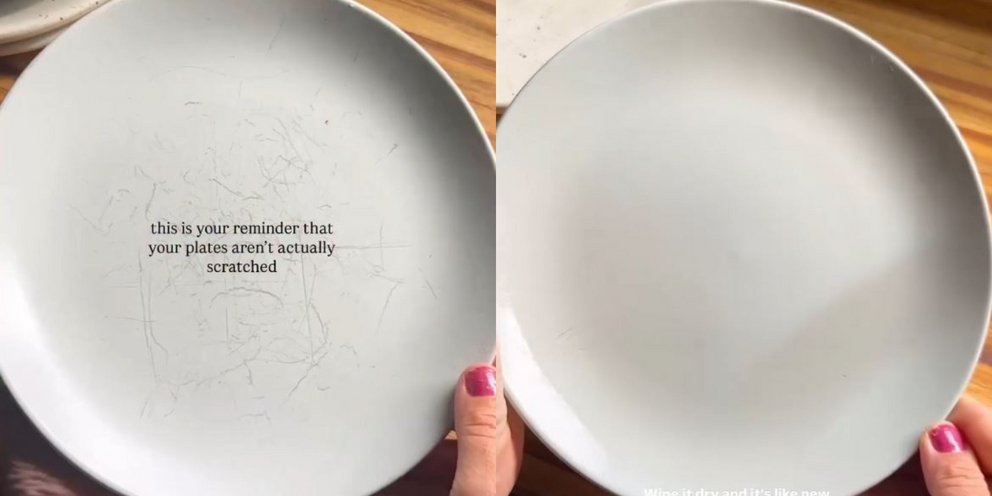Σε αυτό, όπως μπορεί να δει κανείς, η influencer κρατάει ένα πιάτο γεμάτο σημάδια που μοιάζουν με γρατζουνιές και εξηγεί ότι στην πραγματικότητα πρόκειται για ίχνη από μεταλλικά μαχαιροπίρουνα, όχι για μόνιμη φθορά.