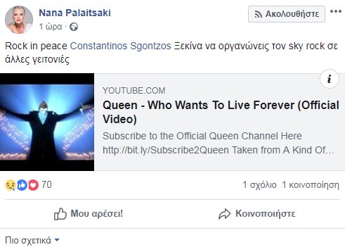 «Rock in peace Constantinos Sgontzos Ξεκίνα να οργανώνεις τον sky rock σε άλλες γειτονιές», έγραψε χαρακτηριστικά στην λεζάντα. Και πρόσθεσε στην ανάρτηση το τραγούδι των Queens, «Who wants to live forever» («Ποιος θέλει να ζήσει για πάντα»).