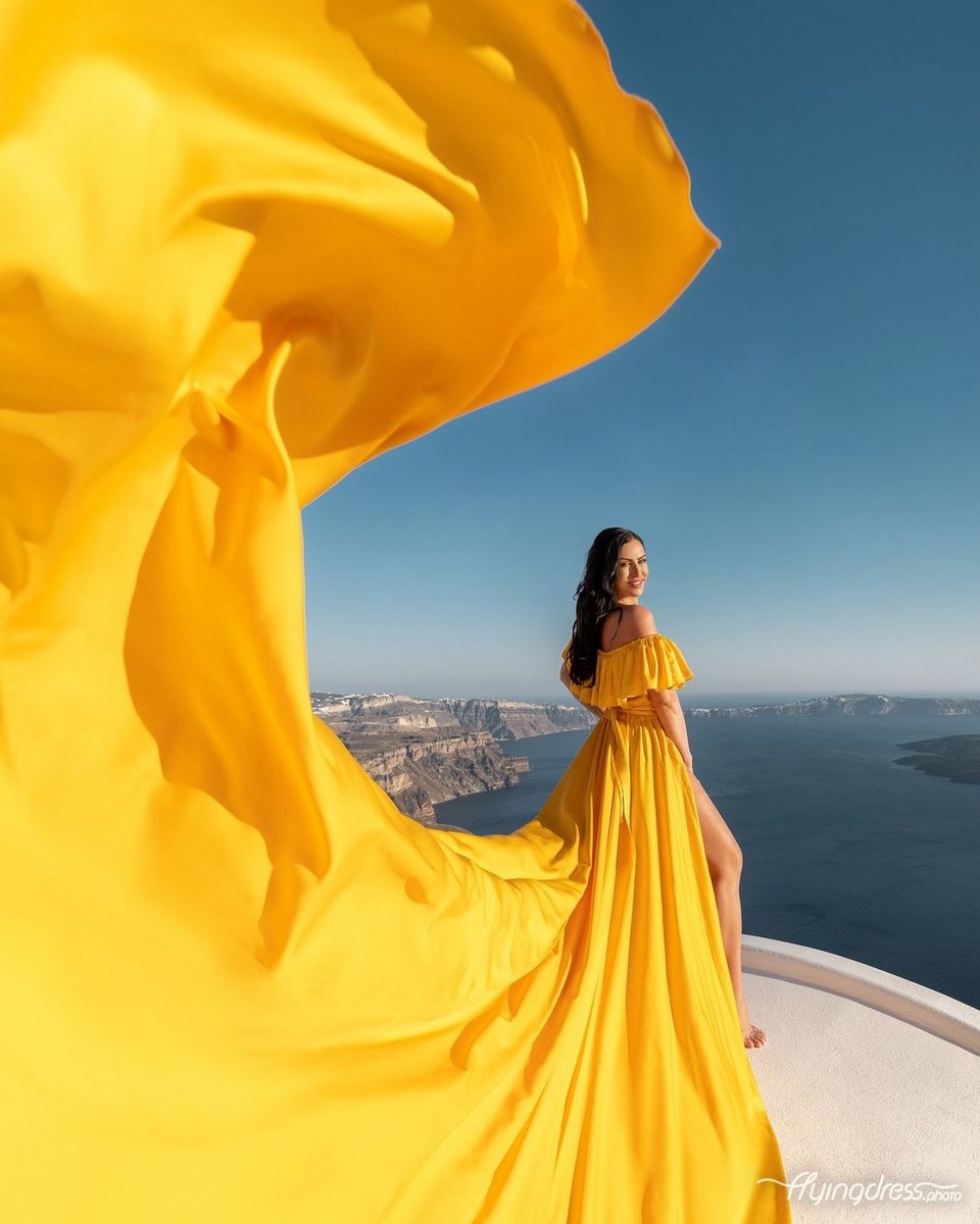 Όπως γράφει το δημοσίευμα, τα τελευταία χρόνια οι φωτογράφοι της Flying Dress Photo στη Σαντορίνη περνούν τα καλοκαίρια τους απαθανατίζοντας την ίδια εικόνα ξανά και ξανά: τουρίστριες που ποζάρουν με φόντο τα ασβεστωμένα σπίτια και τους μπλε τρούλους φορώντας πολυτελή σατέν φορέματα με εξαιρετικά μακριά ουρά.