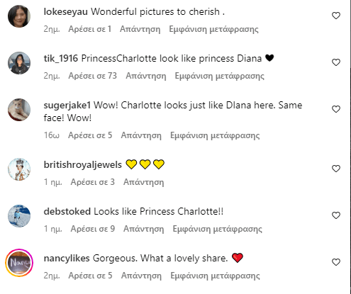 Κάποιος άλλος έγραψε: «Νομίζω ότι η Σάρλοτ είναι ένας συνδυασμός της βασίλισσας Ελισάβετ και της πριγκίπισσας Νταϊάνα». Ένας ακόμη ανέφερε: «Μπορείτε πραγματικά να δείτε την πριγκίπισσα Σάρλοτ στην Νταϊάνα σε αυτή τη φωτογραφία!!».