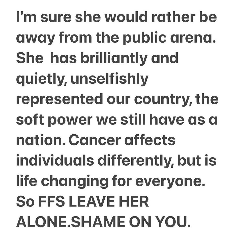 Αναφερόμενος στην περιπέτεια της Κέιτ με την υγεία της πρόσθεσε: «Ο καρκίνος επηρεάζει τον καθένα διαφορετικά, αλλά αλλάζει τη ζωή όλων. Γι’ αυτό, αφήστε την επιτέλους ήσυχη. Ντροπή σας».