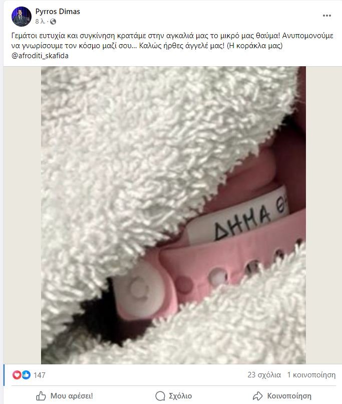 Μπαμπάς έγινε για άλλη μια φορά ο Πύρρος Δήμας, καθώς η σύζυγός του, Αφροδίτη Σκαφίδα, έφερε στον κόσμο ένα υγιέστατο κοριτσάκι.