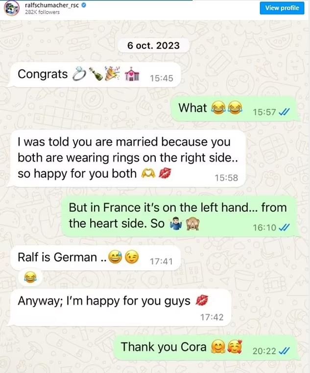 Τώρα όμως, ο Ραλφ Σουμάχερ δημοσίευσε screenshots μιας υποτιθέμενης ανταλλαγής μηνυμάτων από πέρυσι, στην οποία η Κόρα συγχαίρει τον Ετιέν για την σχέση τους, υποδεικνύοντας έτσι πως η Κόρα γνώριζε από την αρχή – μια κίνηση όμως που εκείνη χαρακτηρίζει «αξιολύπητη» και «παράνομη.