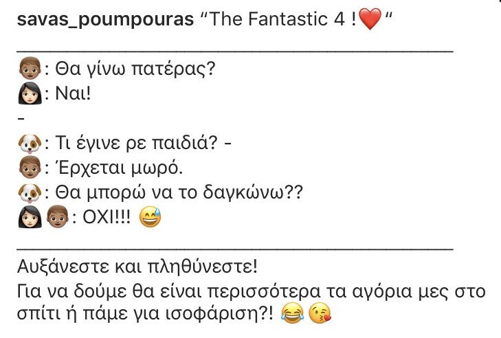 Δίπλα από τη φωτογραφία, γράφει έναν ευφάνταστο διάλογο, που αποκαλύπτει την εγκυμοσύνη της αγαπημένης του. Στην αρχή γράφει «The Fantastic 4!», οι « 4 Φανταστικοί» δηλαδή, όπως είναι και ο τίτλος της γνωστής ταινίας, υποδηλώνοντας έτσι ότι τα μέλη της οικογένειας θα αυξηθούν!