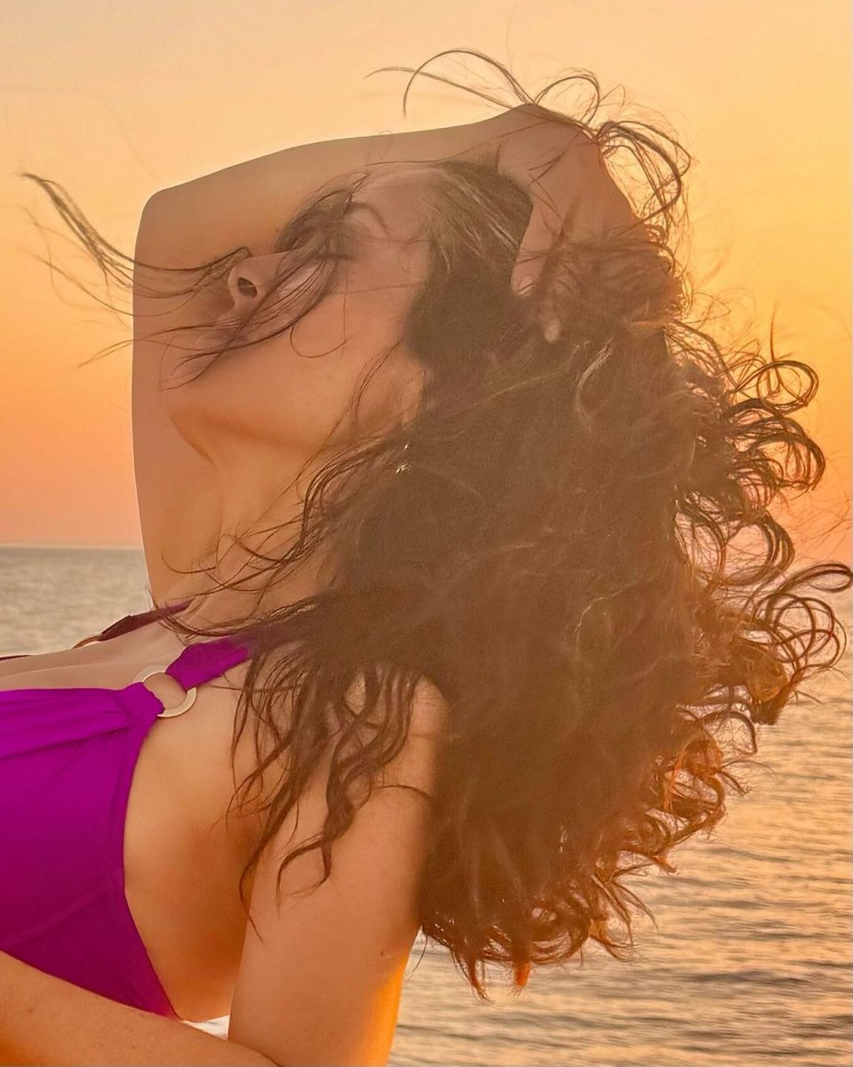 Η ηθοποιός πόζαρε με φόντο το ηλιοβασίλεμα, φορώντας ένα μωβ μπικίνι και παρεό. «Κακή μέρα για τα μαλλιά μου ή ελεύθερη μέρα;», έγραψε στη λεζάντα.