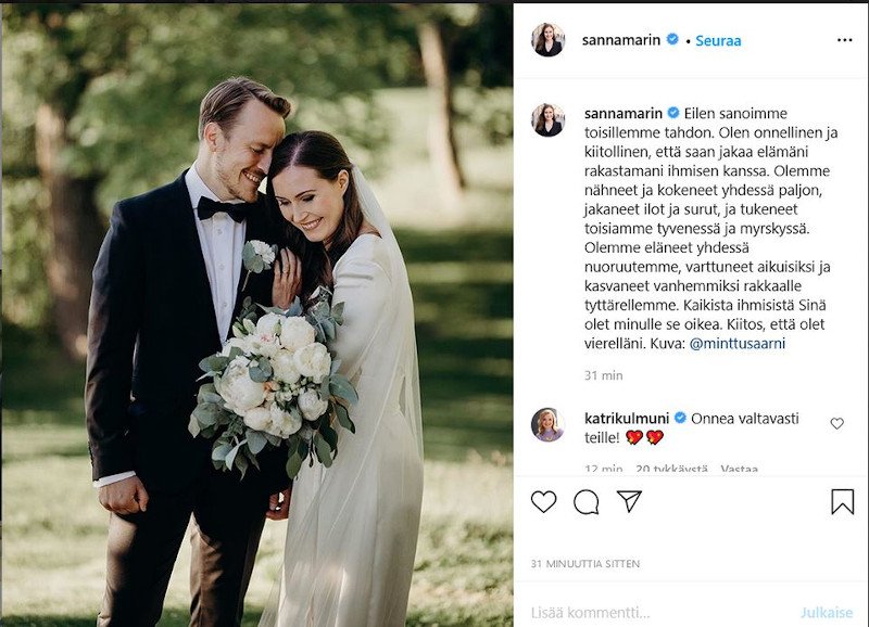 Οκτώ μήνες αφότου ανέλαβε τα ηνία της κυβέρνησης της Φινλανδίας κι έγινε η νεότερη πρωθυπουργός στον κόσμο, η 34χρονη Μάριν ανήρτησε στον λογαριασμό της στο Instagram μια φωτογραφία αγκαλιά με τον σύζυγό της στέλεχος εταιρείας τηλεπικοινωνιών κρατώντας μια ανθοδέσμη και στη συνοδευτική λεζάντα εξέφρασε τη χαρά της που μοιράζεται τη ζωή της με τον άνθρωπο που αγαπά: «Έχουμε βιώσει πολλά μαζί, μοιραστήκαμε χαρές και λύπες, υποστηρίξαμε ο ένας τον άλλον στην ηρεμία και τις καταιγίδες. Έχουμε ζήσει τα νιάτα μας μαζί, ενηλικιωθήκαμε και μεγαλώνουμε την αγαπημένη μας κόρη. Σε ευχαριστώ που είσαι δίπλα μου», αναφέρει.