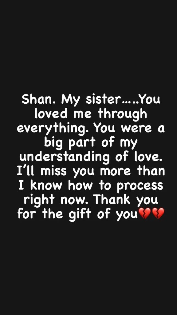 «Η σχέση μας ήταν πραγματική και ειλικρινής. Μας έφερναν τόσο συχνά αντιμέτωπες, αλλά τίποτα από αυτά δεν αντανακλούσε την αλήθεια της πραγματικής μας σχέσης, η οποία ήταν μια σχέση που χτίστηκε πάνω στον αμοιβαίο σεβασμό και θαυμασμό. Η Σάνεν ήταν θαρραλέα, παθιασμένη αποφασισμένη και πολύ τρυφερή και γενναιόδωρη. Θα μου λείψει και θα την τιμή πάντα βαθιά στην καρδιά μου και στις αναμνήσεις μου. Η καρδιά μου ραγίζει για την οικογένειά της και τον σκύλο της».