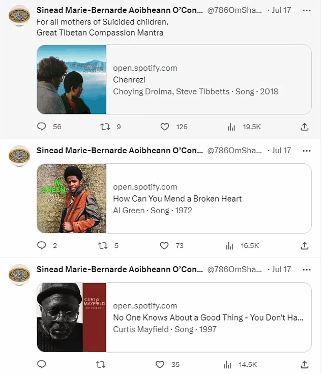 Το συναισθηματικό αφιέρωμα ακολούθησαν τέσσερα tweets που συνδέονταν με τραγούδια που πιθανώς άκουγε, μεταξύ των οποίων το «Chenrezi» των Ani Choying Drolma και Steve Tibbetts - το οποίο η Σινέντ Ο’ Κόνορ αφιέρωσε σε άλλες πενθούσες μητέρες.