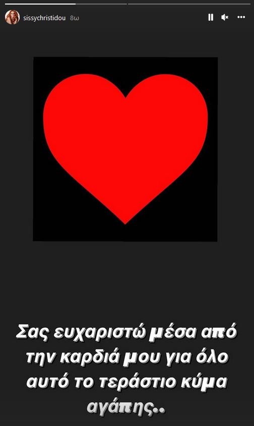 Και στο πρώτο της μήνυμα η Σίσσυ Χρηστίδου θέλησε να ευχαριστήσει όλους όσους της συμπαραστάθηκαν. «Σας ευχαριστώ μέσα από την καρδιά μου για όλο αυτό το τεράστιο κύμα αγάπης», έγραψε στα social media.