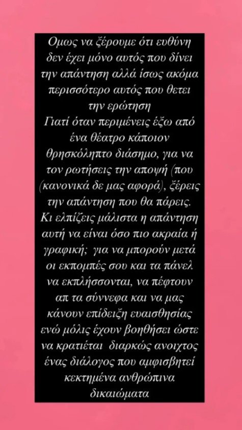 Ολόκληρη η ανάρτησή της: «Όμως να ξέρουμε ότι ευθύνη δεν έχει μόνο αυτός που δίνει την απάντηση, αλλά ίσως ακόμα περισσότερο αυτός που θέτει την ερώτηση. Γιατί όταν περιμένεις έξω από ένα θέατρο κάποιον θρησκόληπτο διάσημο, για να ρωτήσεις την άποψή του (που κανονικά δεν μας αφορά), ξέρεις την απάντηση που θα πάρεις. Κι ελπίζεις, μάλιστα, η απάντηση αυτή να είναι όσο πιο ακραία ή γραφική; Για να μπορούν μετά οι εκπομπές σου και τα πάνελ να εκπλήσσονται, να πέφτουν από τα σύννεφα και να μας κάνουν επίδειξη ευαισθησίας, ενώ μόλις έχουν βοηθήσει ώστε να κρατιέται διαρκώς ανοιχτός ένας διάλογος που αμφισβητεί κεκτημένα ανθρώπινα δικαιώματα».