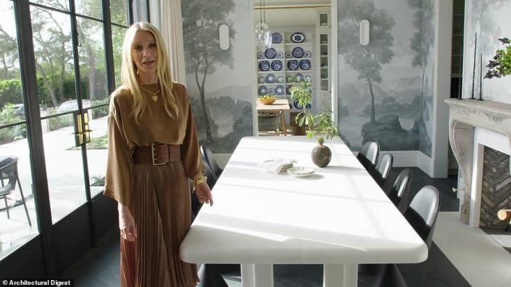 Το επόμενο δωμάτιο στο οποίο συνεχίζει τη ξενάγηση η Γκουίνεθ Παλτροου, είναι η τραπεζαρία, ενώ ταυτόχρονα αποκαλύπτει ότι επιστράτευσε τη φίλη της, την εσωτερική σχεδιάστρια Brigette Romanek, για να την βοηθήσει στην επίπλωση του σπιτιού. Οσο για το φουτουριστικό φωτιστικό στην κλασική τραπεζαρία η Πάλτροού αποκάλυψε ότι είχαν κάποιες διαφωνίες επ' αυτού με τη διακοσμήτρια όμως εν τέλει συμφώνησαν και όπως είπε το αποτέλεσμα είναι «αρκετά δροσερό και υπέροχο».