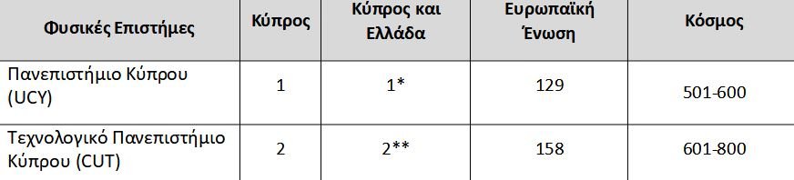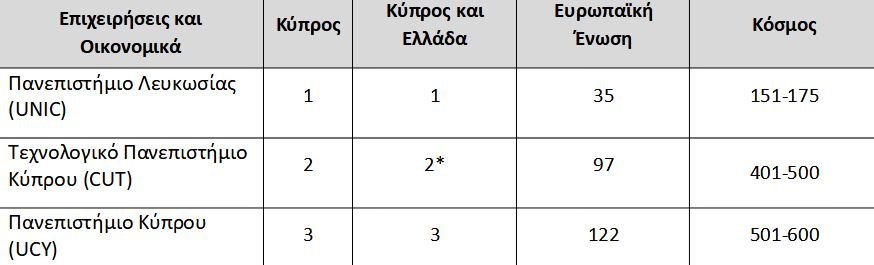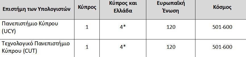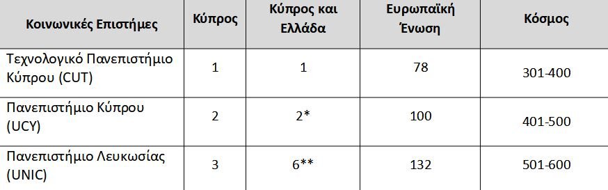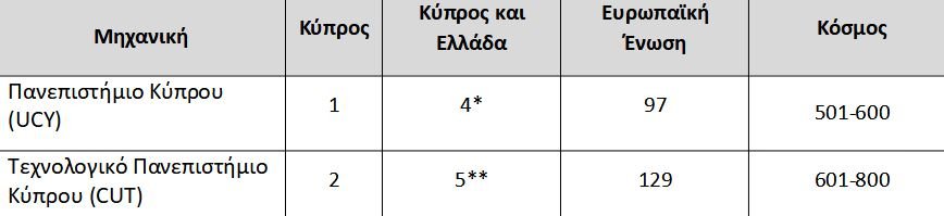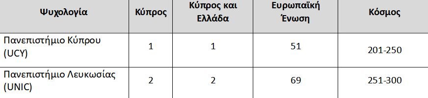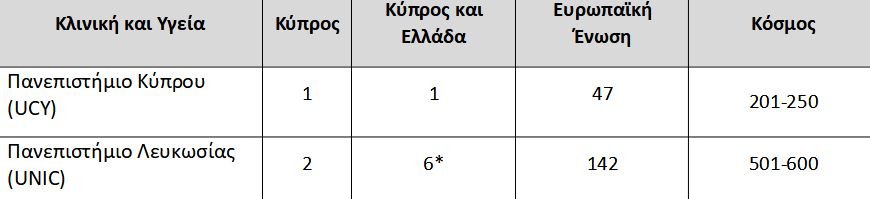 Η κατάταξη των κυπριακών πανεπιστημίων στη λίστα Τimes Higher Education, World University Rankings By Subject για το 2023, σε πέντε ενδεικτικά αντικείμενα: